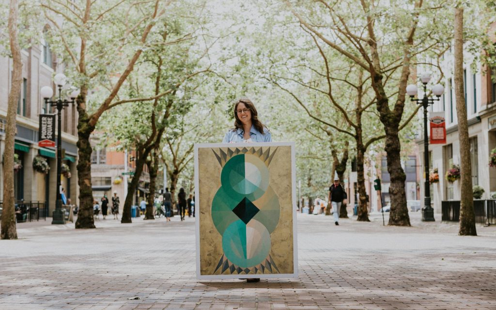 Stephanie Scott is a Seattle-based abstract oil painter known for her geometric compositions, combining symbolic color, hard-edged shapes, and gold leaf to convey deep emotional themes. She began her artistic journey after a significant event in her youth and has developed her distinctive style through rigorous training and education, including a BFA from Cornish College of the Arts and further studies at Gage Academy. In addition to her visual art, Scott hosts “Brush Work,” a podcast aimed at emerging artists and shares her creative process live on Twitch, engaging a community of collectors and enthusiasts. With two residencies at the Jerusalem Studio School under her belt, she is a self-represented artist showcasing her work in the Pacific Northwest.