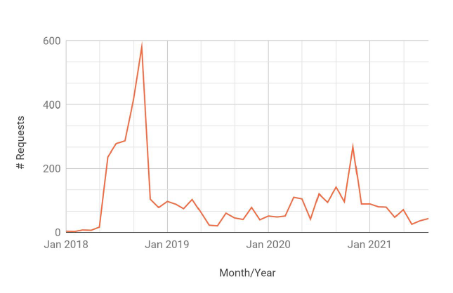 Here’s an illustration of the total volume of requests Tucows has received since the launch of our Tiered Access platform. There are fluctuations in our request volumes, but the monthly totals tend to fall within a consistent range (with the exception of spikes in November 2018, and November 2020):
