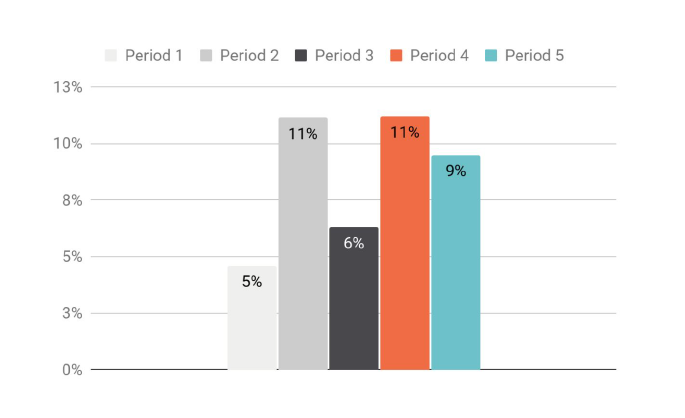 Period 5 saw no duplicates from multiple sources, while the rate of duplicate requests from the same source dropped from 3% in period 4 to 1% in period 5: