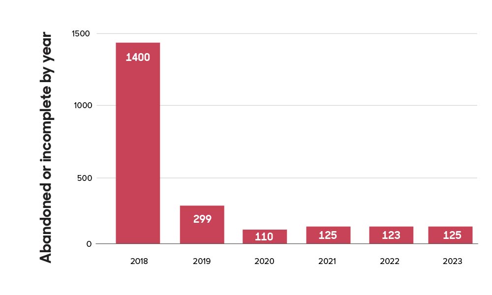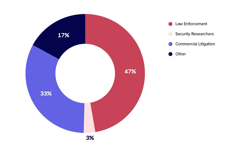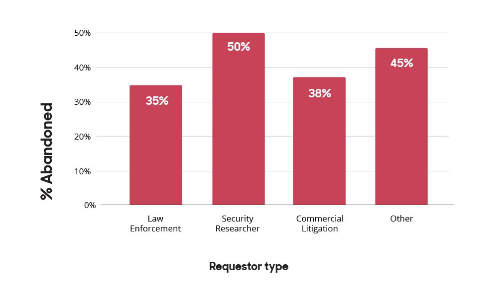 A request is considered “abandoned” when insufficient data is provided for us to make a disclosure decision and the requestor doesn’t respond to our request for more information by the time we compile the report. The chart below shows us the portion of requests submitted by each requestor group that were then abandoned; Law Enforcement is least likely to abandon requests.