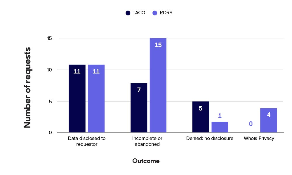 All this makes it difficult to draw comparisons between our raw TACO statistics and ICANN’s RDRS. That said, within our own reporting, we have categorized each RDRS request using the appropriate TACO term to make comparing the two systems possible. We hope this is useful.