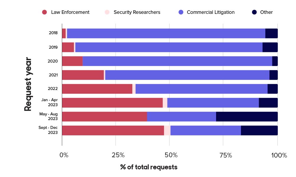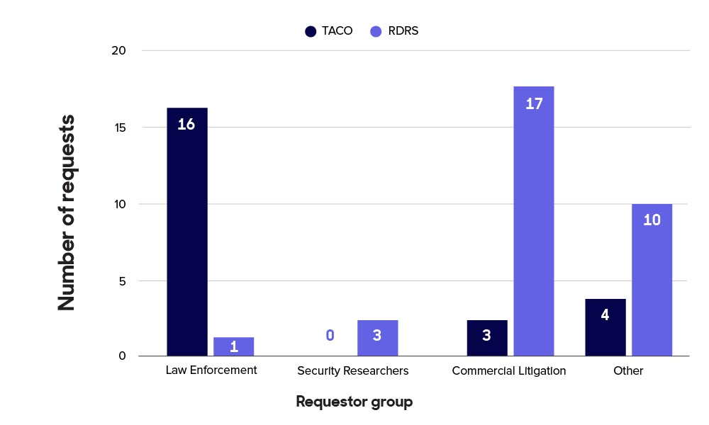 In our TACO reporting, we sort each requestor into a category: LEA, Commercial Litigation, Security Researcher, and Other. This helps us identify broad trends (internally, we also distinguish between, for example, local and foreign law enforcement). The RDRS, in contrast, allows each requestor to assign a category to each request. This means a person can make a “law enforcement” request one day and a “litigation” request the next. While the form and function of the RDRS require this type of self-reporting, it is frustrating from our perspective—if only because it complicates comparing the two systems!