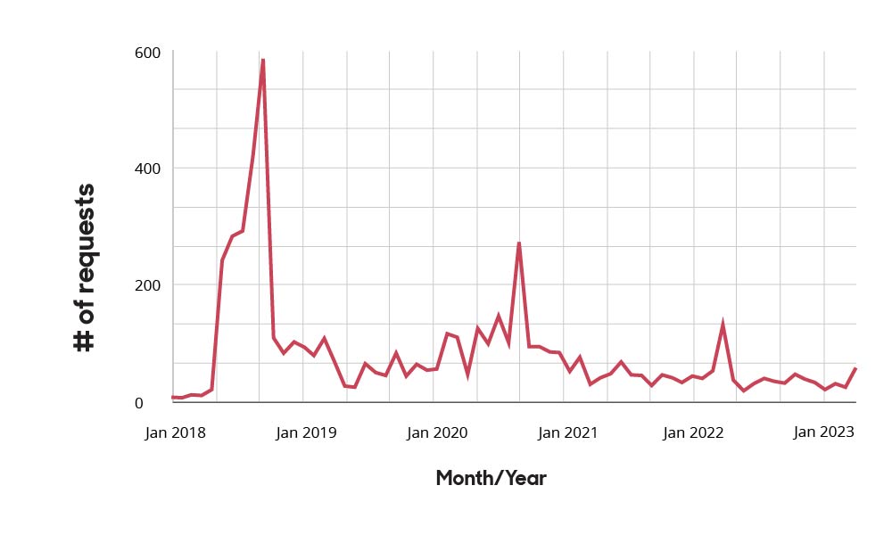 When we look at the total request volume since we first started operating the TACO platform in 2018, annual totals continue to drop, even if monthly rates fluctuate.