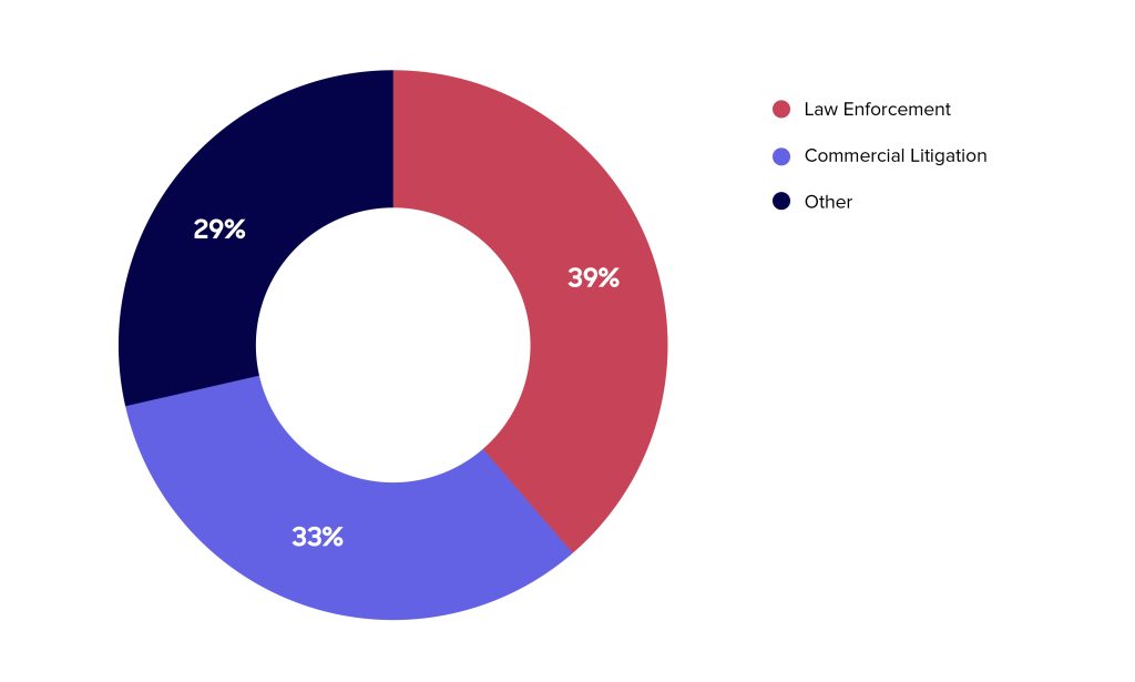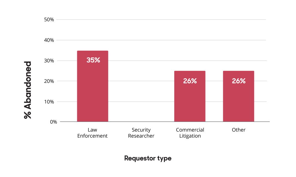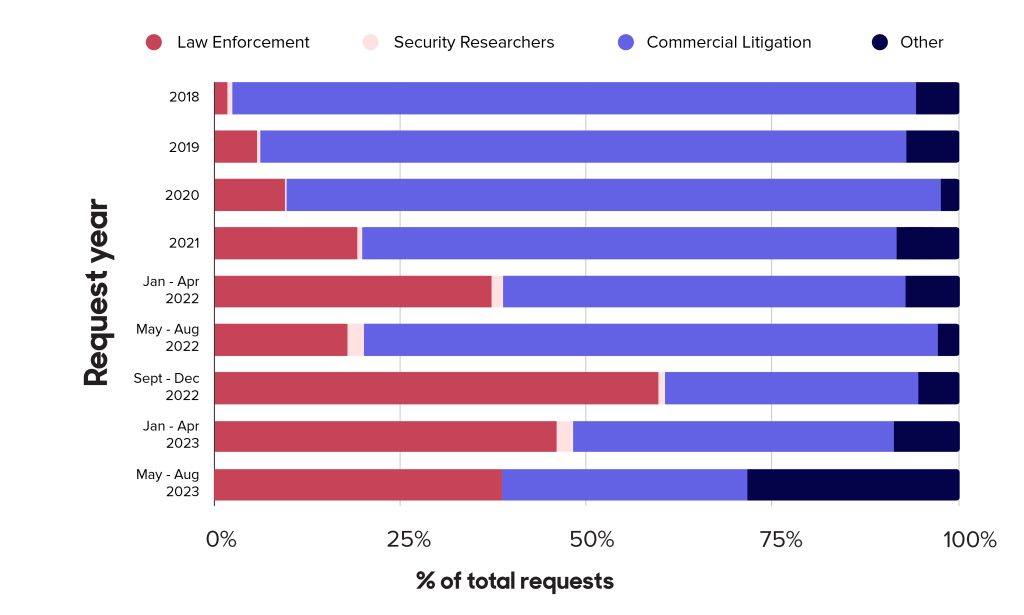Requests during this period were fairly evenly dispersed among law enforcement, commercial litigation, and “other,” which is a significant increase in requests attributed to the “other” category. These “other” requestors included hosting providers working on fraud investigations as well as cryptocurrency and other fraud victims seeking assistance. It also included a series of requests from a foreign government, which is not quite the same as foreign law enforcement, which is counted in the law enforcement group.