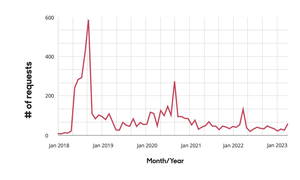 Finally, we can look at the total number of requests received over just about five years of operating our TACO platform. The monthly rate still shows spikes every so often, though not as much as we saw in 2018 just before the ICANN63 meeting, which we wrote about in our very first TACO Stats post.