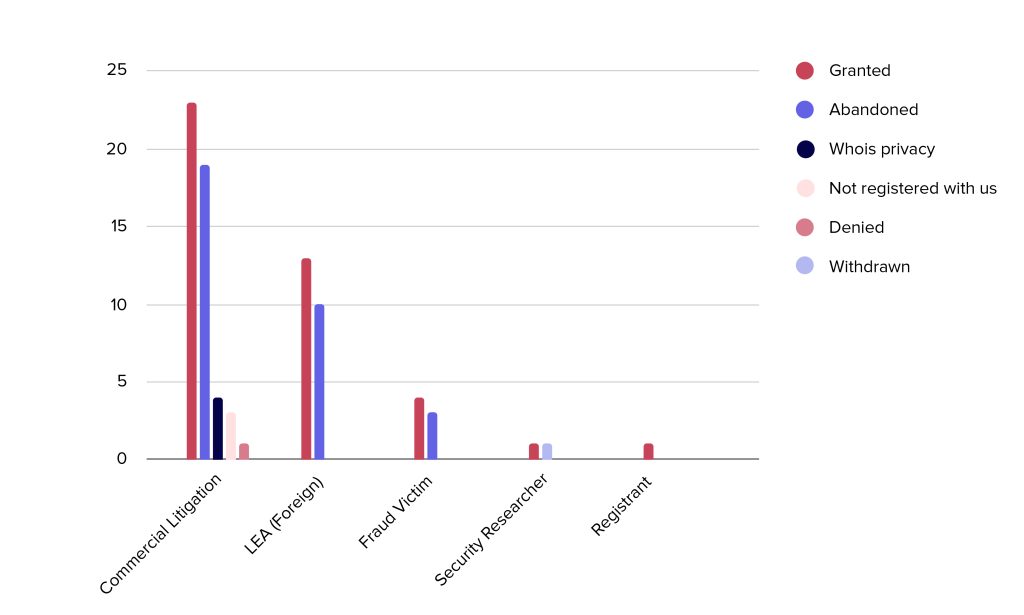Our successful disclosure rate was back up this period, after a decrease last time due to the high volume of requests for domains that were not registered with us. The rate of abandoned requests remained steady while denials dropped back down and requests for domains with Whois Privacy enabled on them increased somewhat.