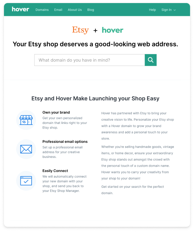 Don’t send customers on a Google search and risk having them land on a competitor. Help them get the domain they need by referring them to Hover.